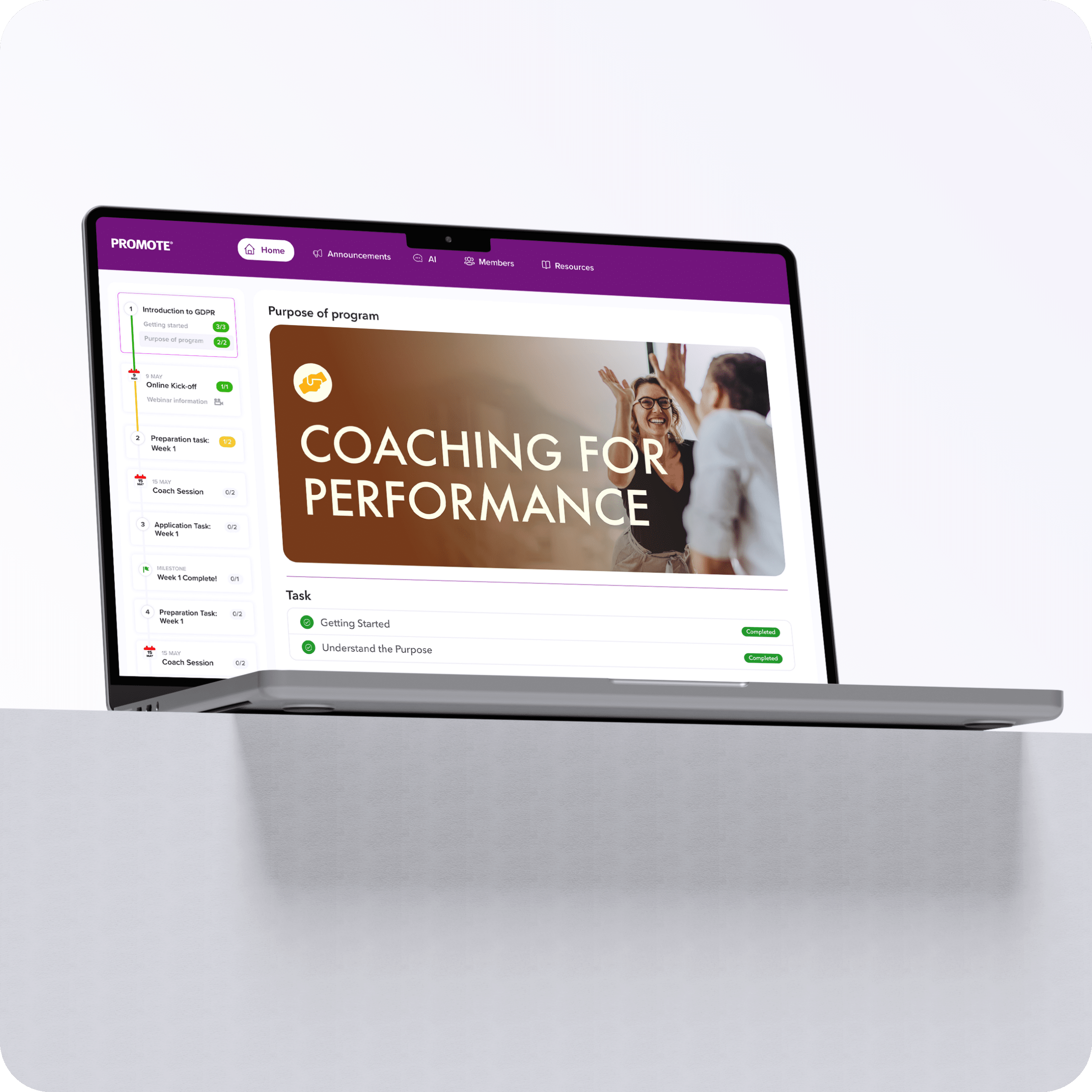 Promote transforms coaching from isolated sessions into continuous development journeys, combining reflection, action, and feedback over time.